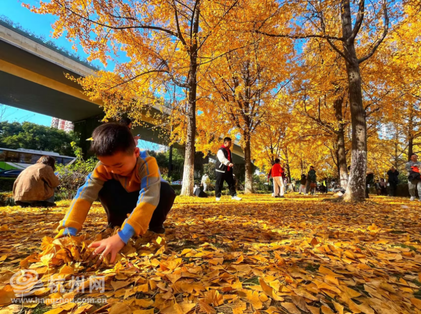 写真集:杭州市の街並みの銀杏林が親子遊び場に