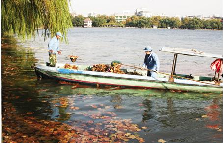 一晩の北風がしきりに吹いたため、27日昼だけで、西湖風景区には、12トンの青桐、クス、カエデの葉っぱが舞い散った。昨日、西湖風景区市政市容管理処の人は、「落葉は軽いから、12トンの葉っぱが何枚かを数えられないだが、これらの葉っぱを全部で集めると、少なくとも阮公墩の大きさになるだろう」「今日は今年に落葉が一番多い日だよ」と記者に語った。