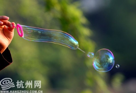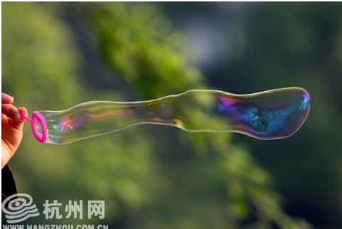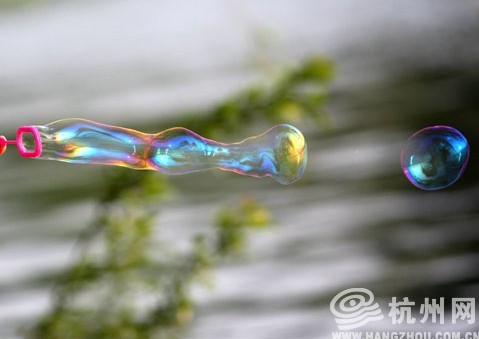 昨日午前中、ある赤服を着てる女の子は蘇堤の辺にある椅子に座っていた。彼女はシャボン玉を遊んでいた。毎回、彼女の手が上げると、風も協力して、綺麗な大きいシャボン玉を次々と吹いた。多くのシャボン玉は風で長く伸ばされた。シャボン玉を通して、蘇堤の姿も見えた。赤服の女の子は夢中で、長い時間に遊んだ。「少なくとも40分があった、シャッターを押す音も彼女を騒がしなかった」と赤服の女の子の後ろ従っていた3人の撮影愛好者は言った。