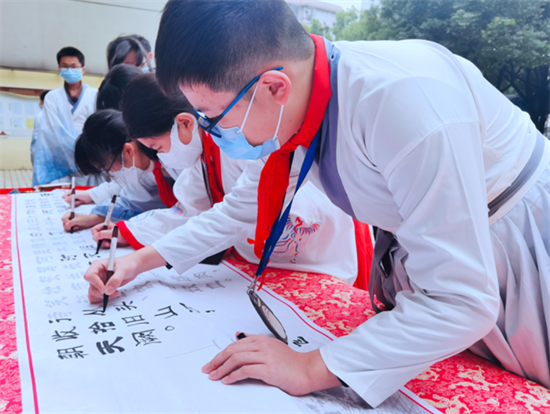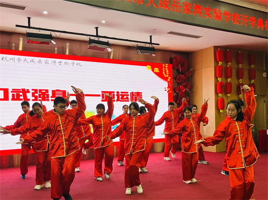 2月6日午後、杭州市大成岳家湾実験学校で「文武両道、忠義伝承」をテーマとする開学式が行われた。学生たちは漢服姿で、一人ずつ一本のペンを持ち、岳飛の製作した詞の『満江紅』の模写を共に完成した。
