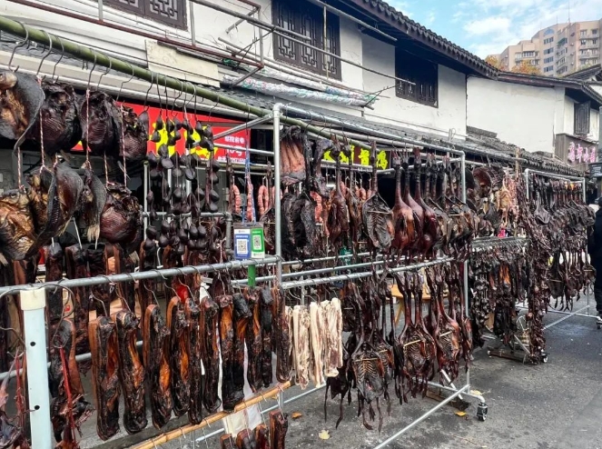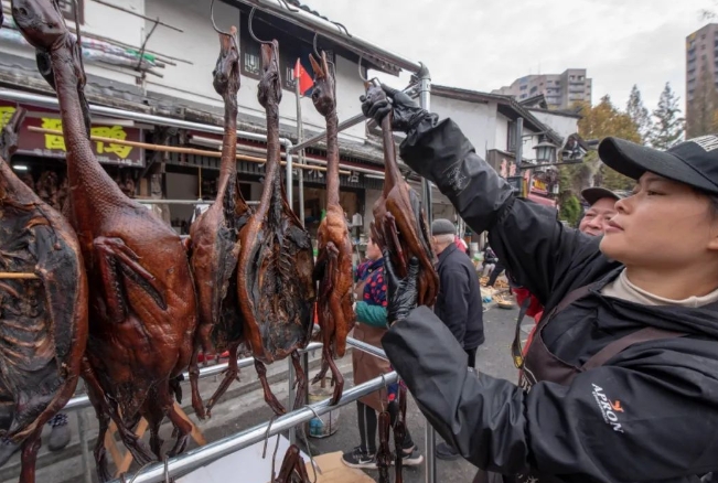 冬のシーズン、アヒルの煮込みが杭州のシンボル的美食となった。これらのアヒルの煮込みの色がつやつやと赤く輝き、味が美味しいため、人気を集めている。杭州のある小路にある多くのアヒルの煮込み店舗は、毎年、アヒルの煮込みの販売量が10万羽を超えるという。