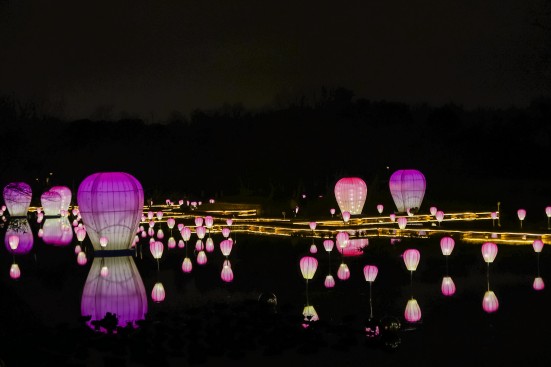 杭州西渓湿地の梅の花と花提灯が新年を共に祝う