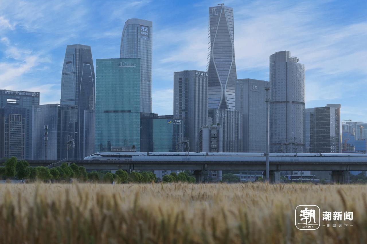 このほど、杭州・銭江世紀城近くの畑では成熟した金色の麦穗が、遠くに聳える高層ビルと疾走する新幹線と共に、美しい絵巻を織りなした。