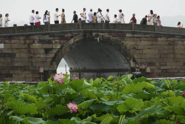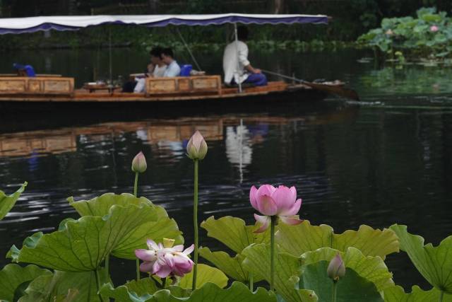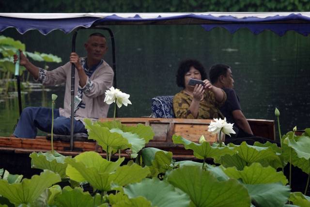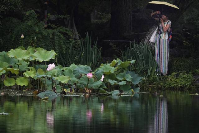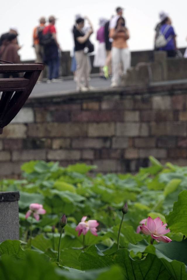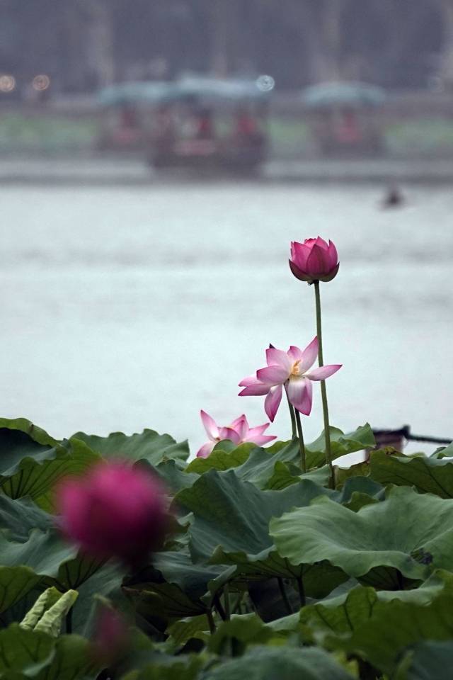 6月9日、杭州西湖では雨の中、市民や観光客が色どりのハスの花を楽しんだ。